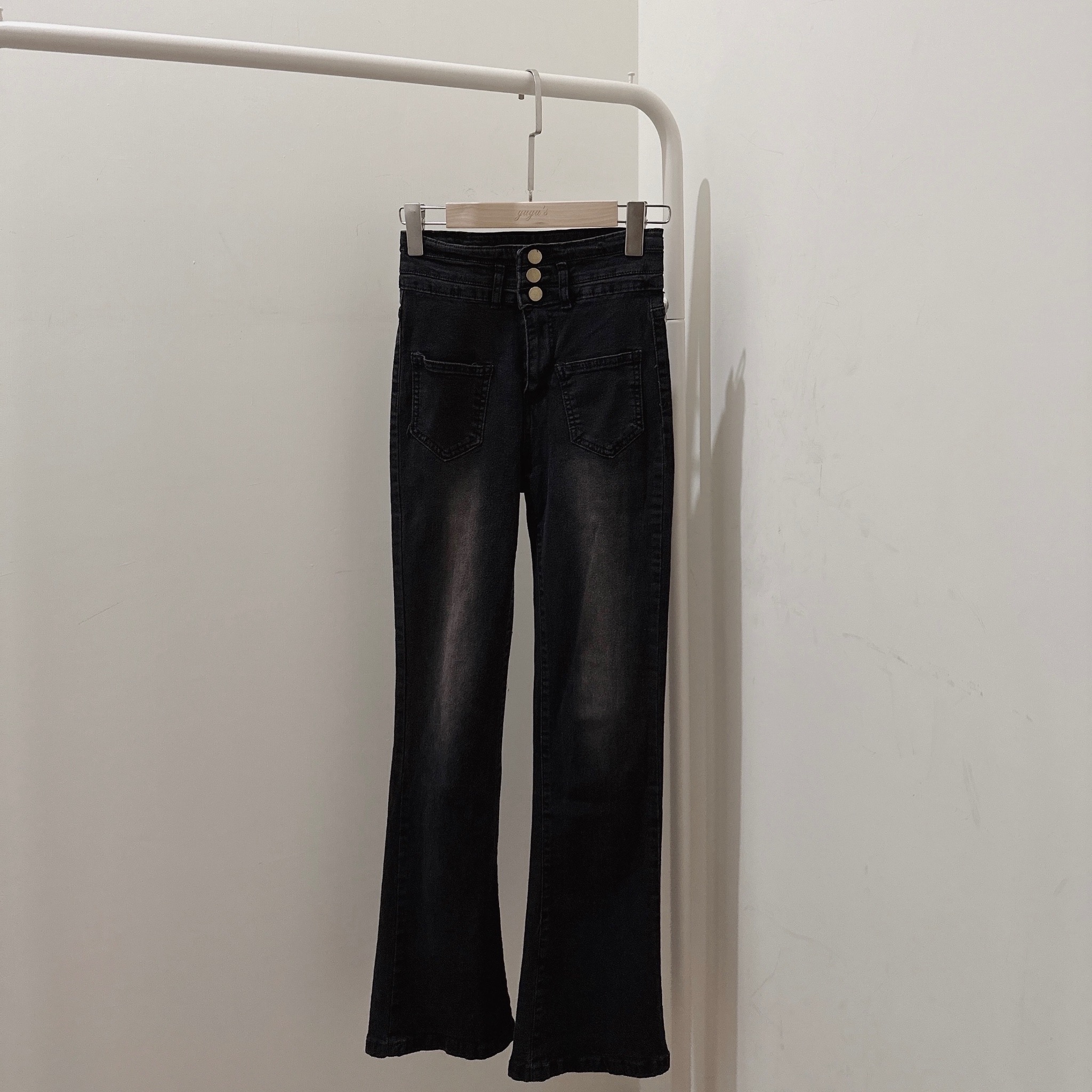 #黑灰刷色高腰排扣牛仔長褲