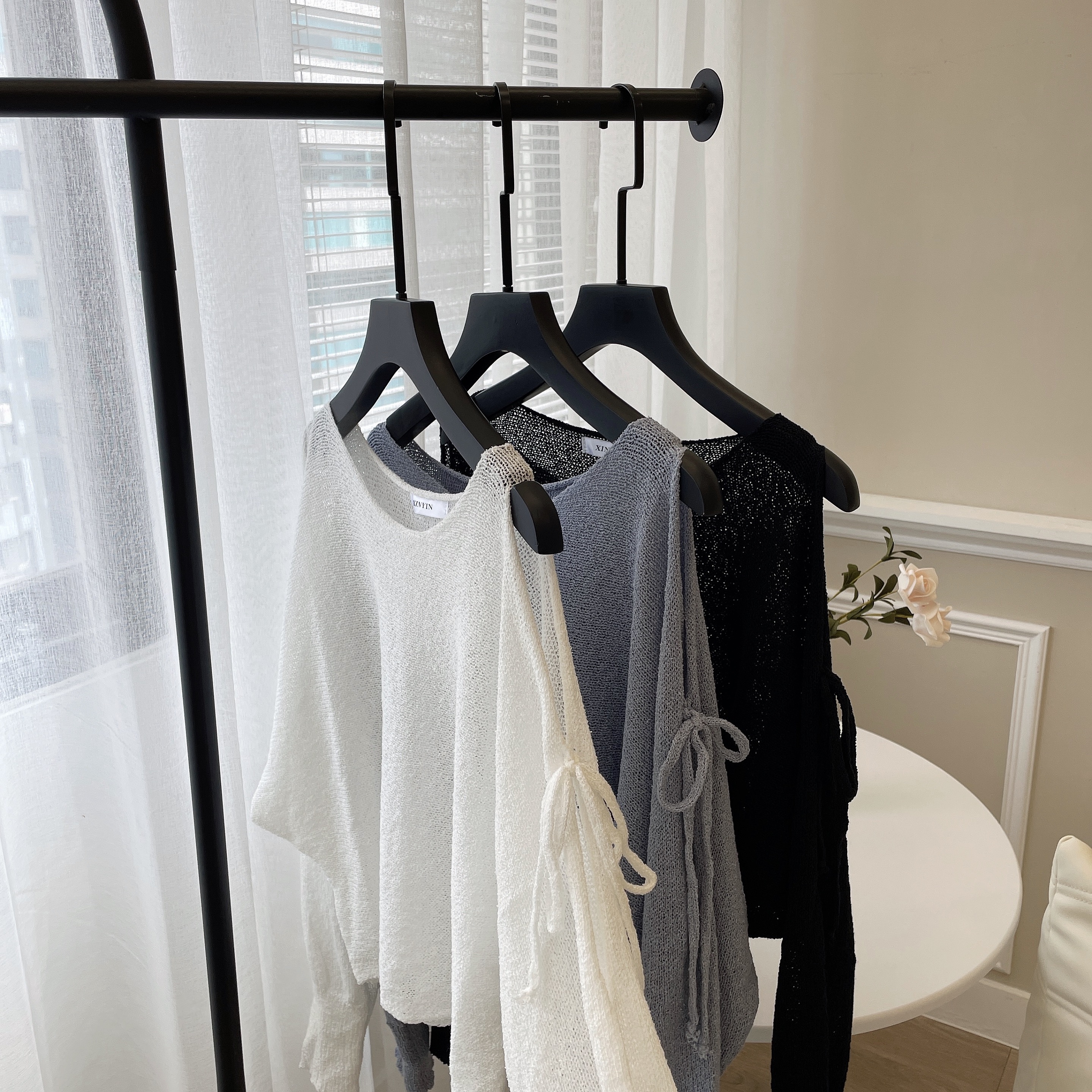 #細針織微透挖肩綁帶長袖