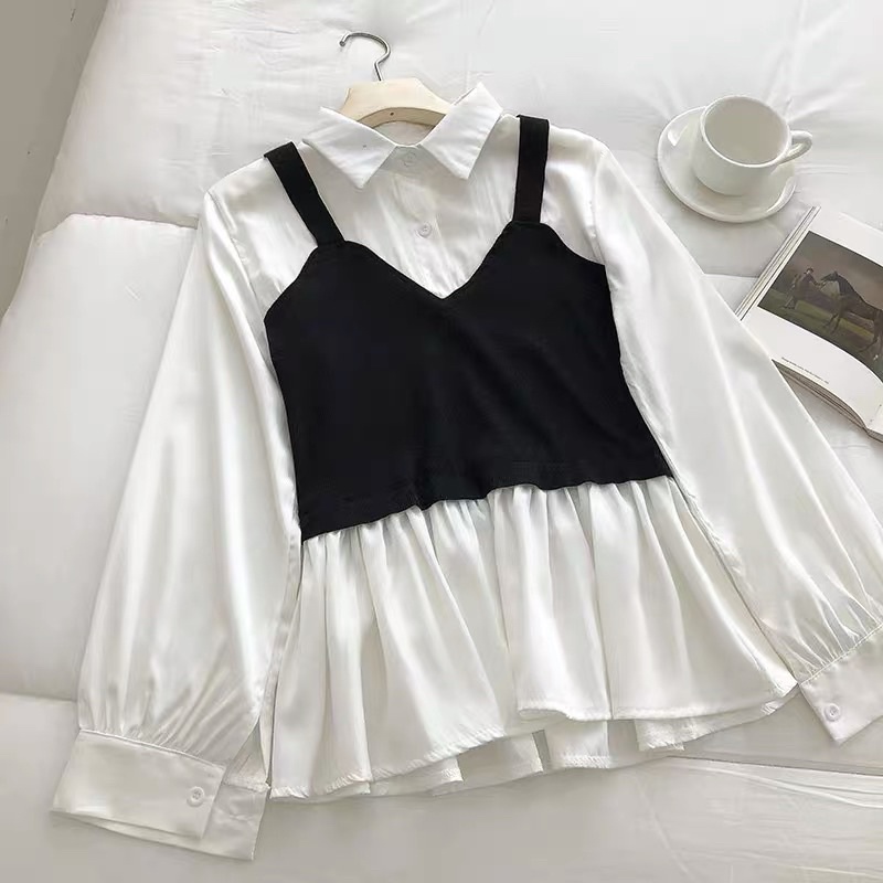 #柔軟澎袖假兩件背心襯衫