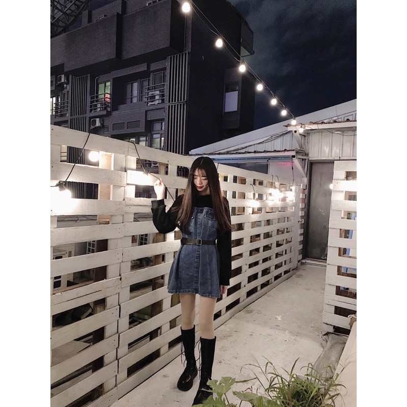 假兩件設計 袖子做是螺紋材質拼接牛仔裙