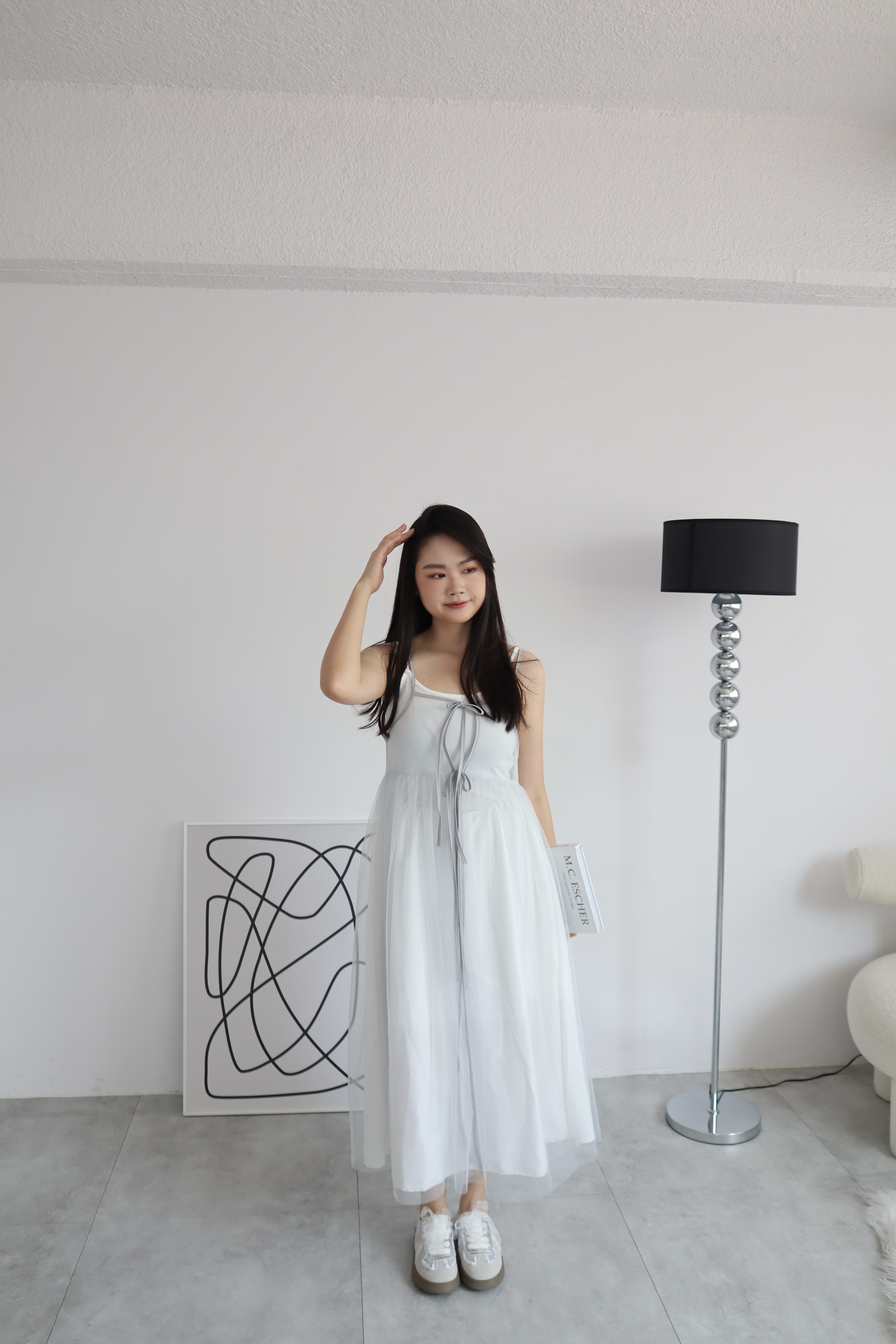 # 純白細肩吊帶縮腰長裙