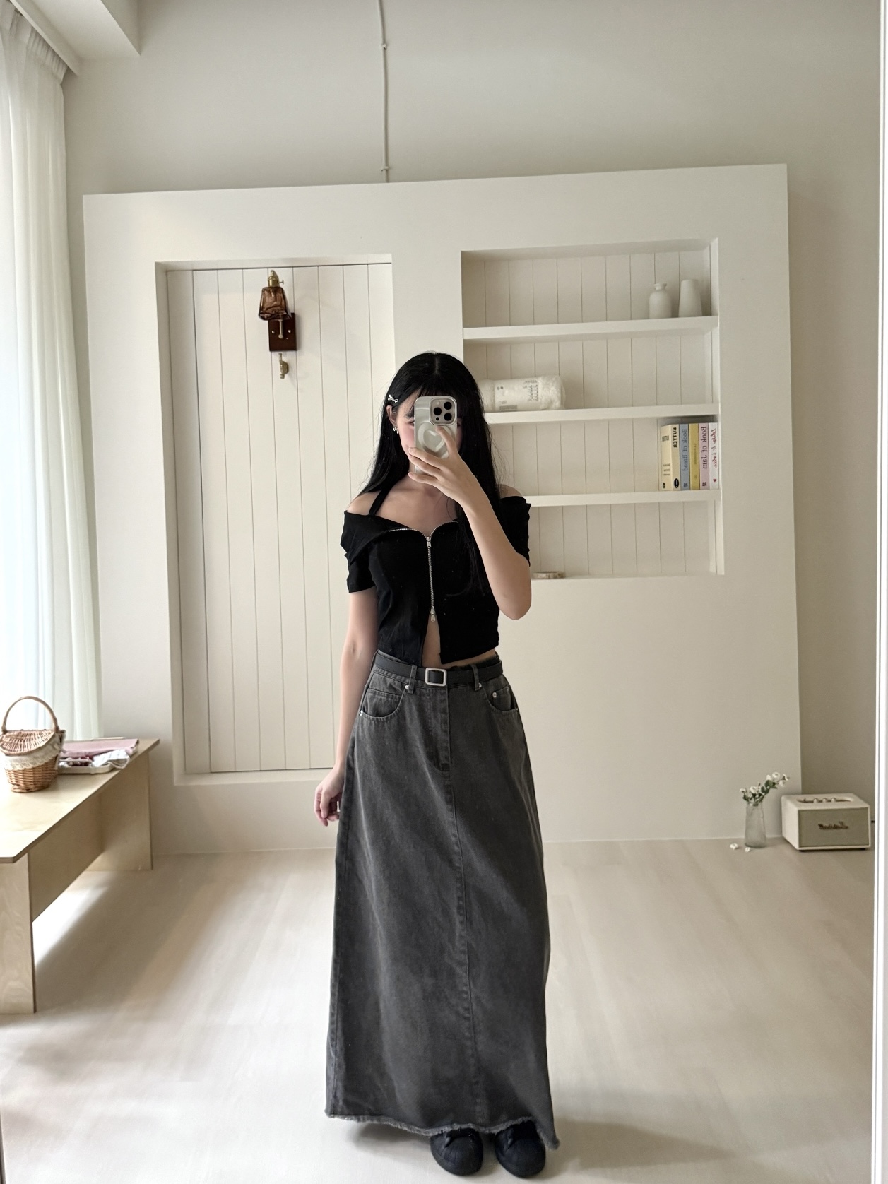 # 單扣水洗牛仔A字長裙