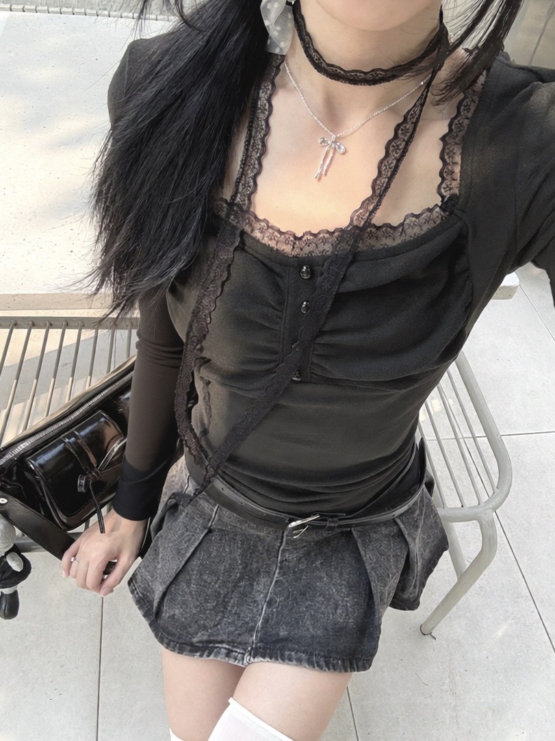 # 蕾絲方領薄棉長袖附繞脖
