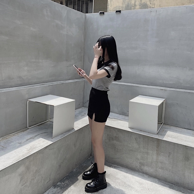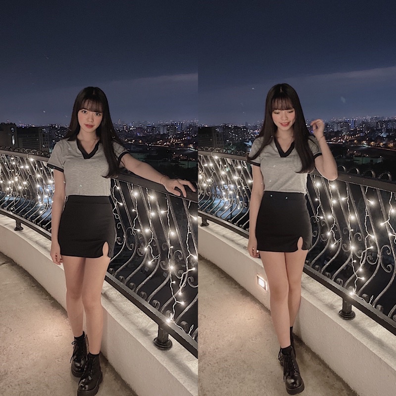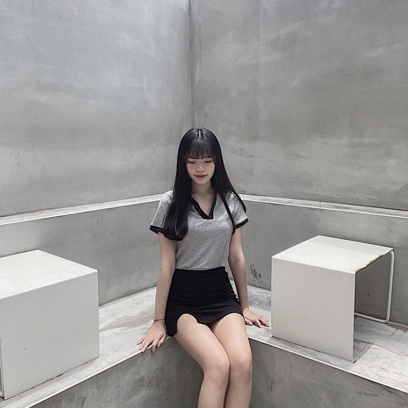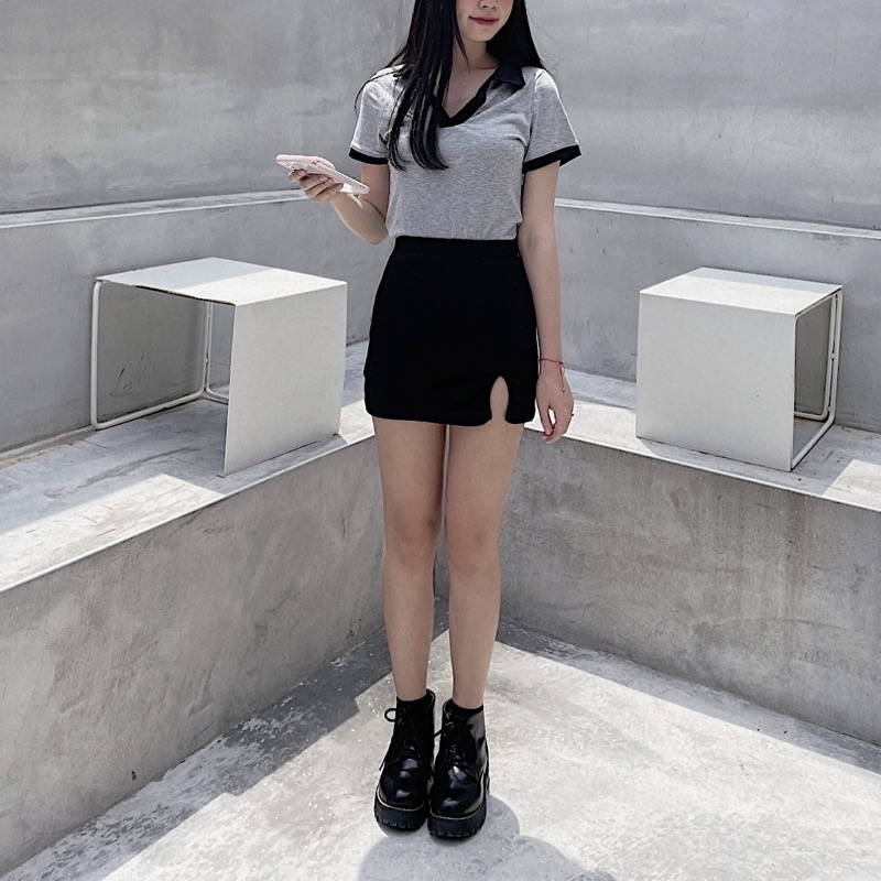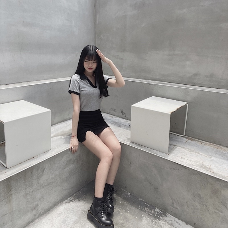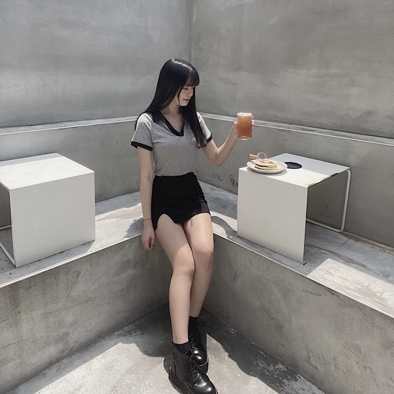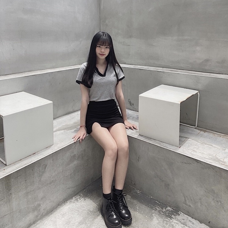 灰+深黑藍拼接領口穿起來很氣質~ 整件衣服都有彈性