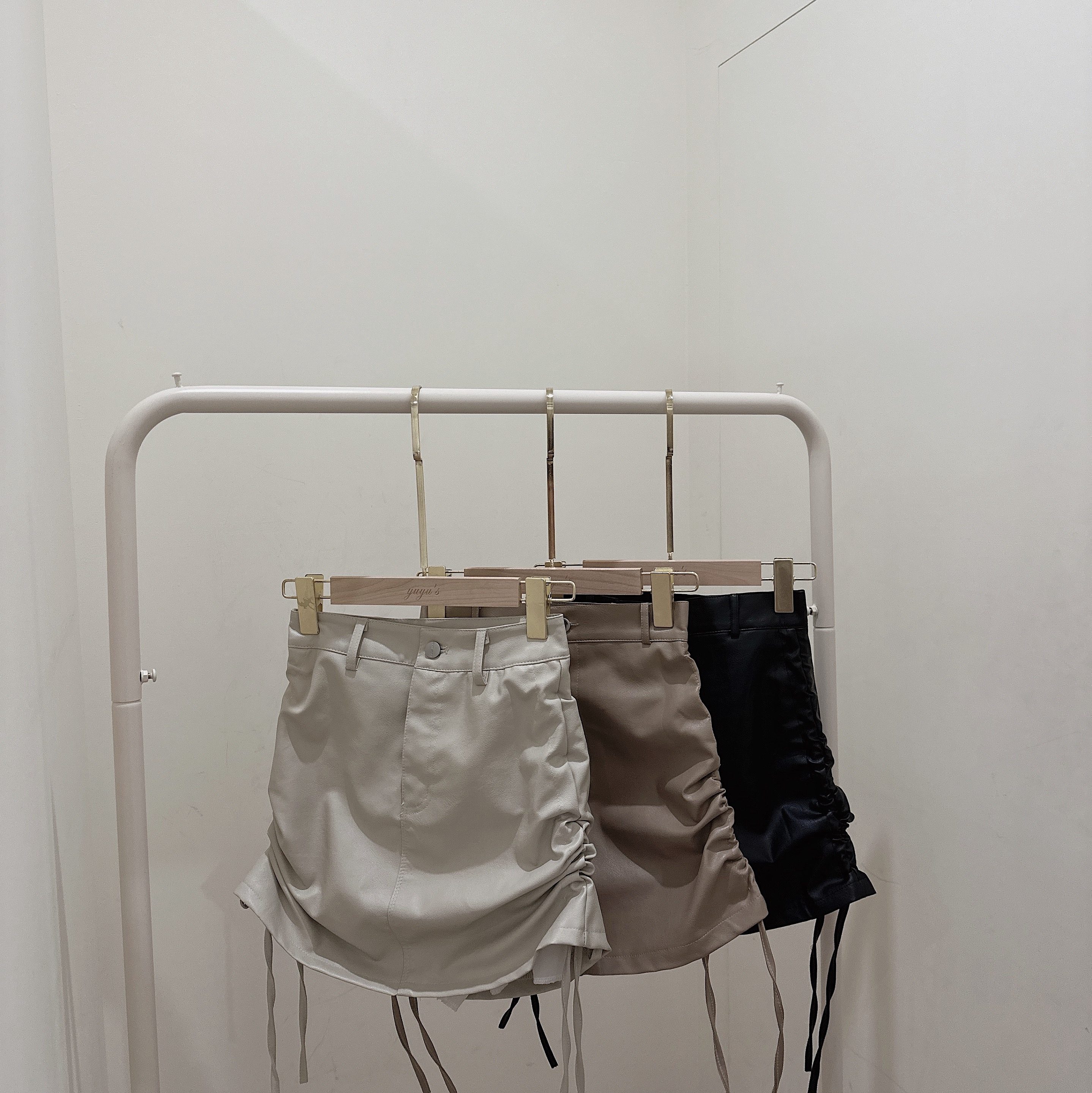 #抽繩綁帶高腰A字皮短裙