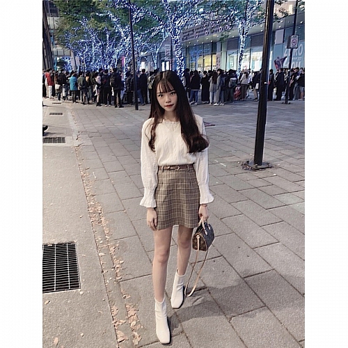 蕾絲花邊襯衫 麻花紋針織背心 可可格紋裙