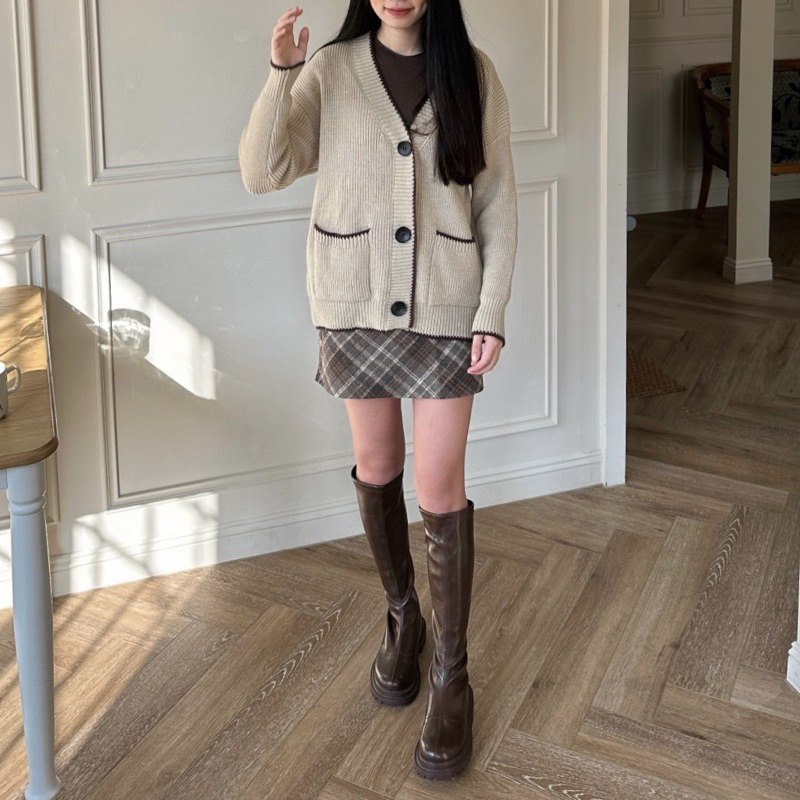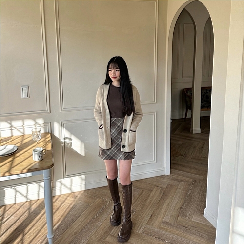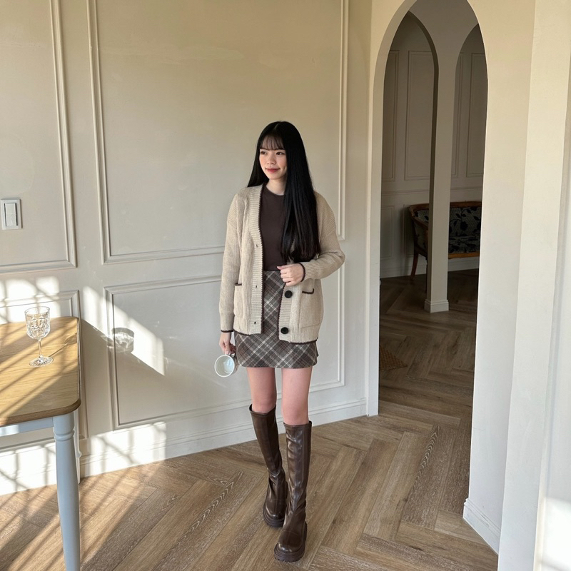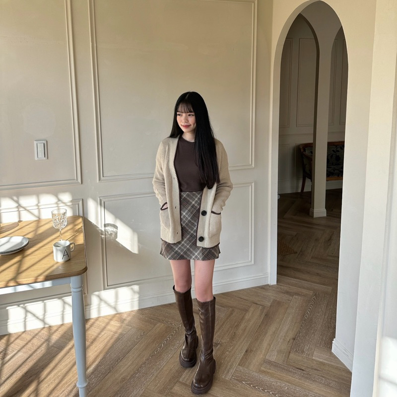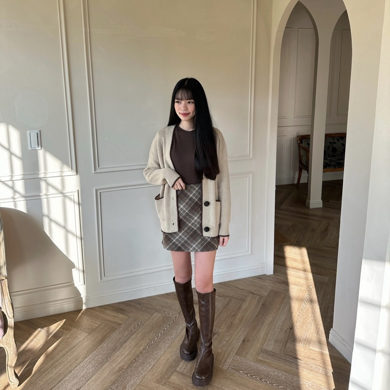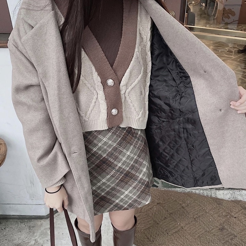 #深咖菱格紋毛呢短裙
