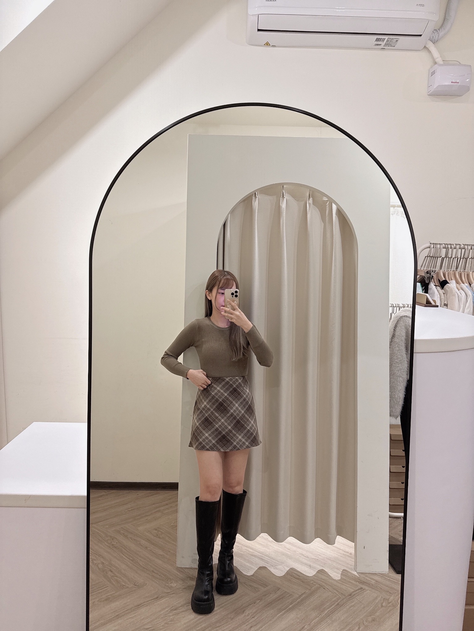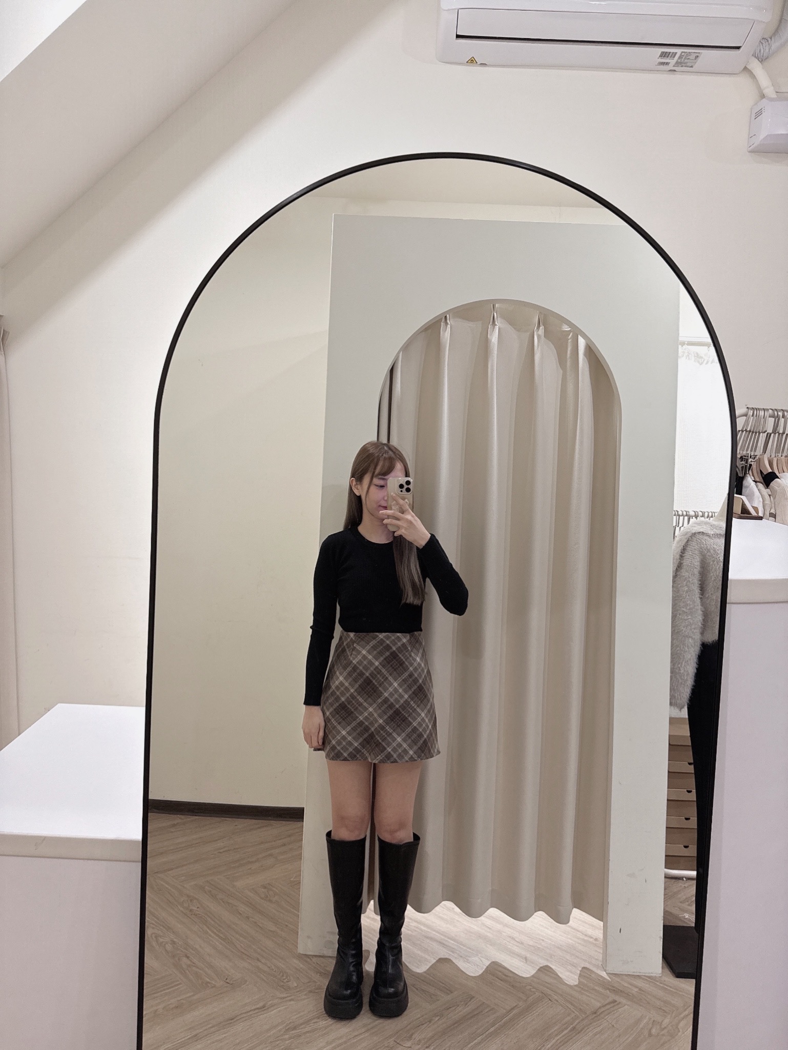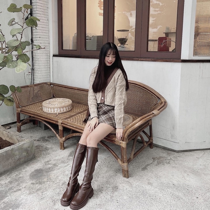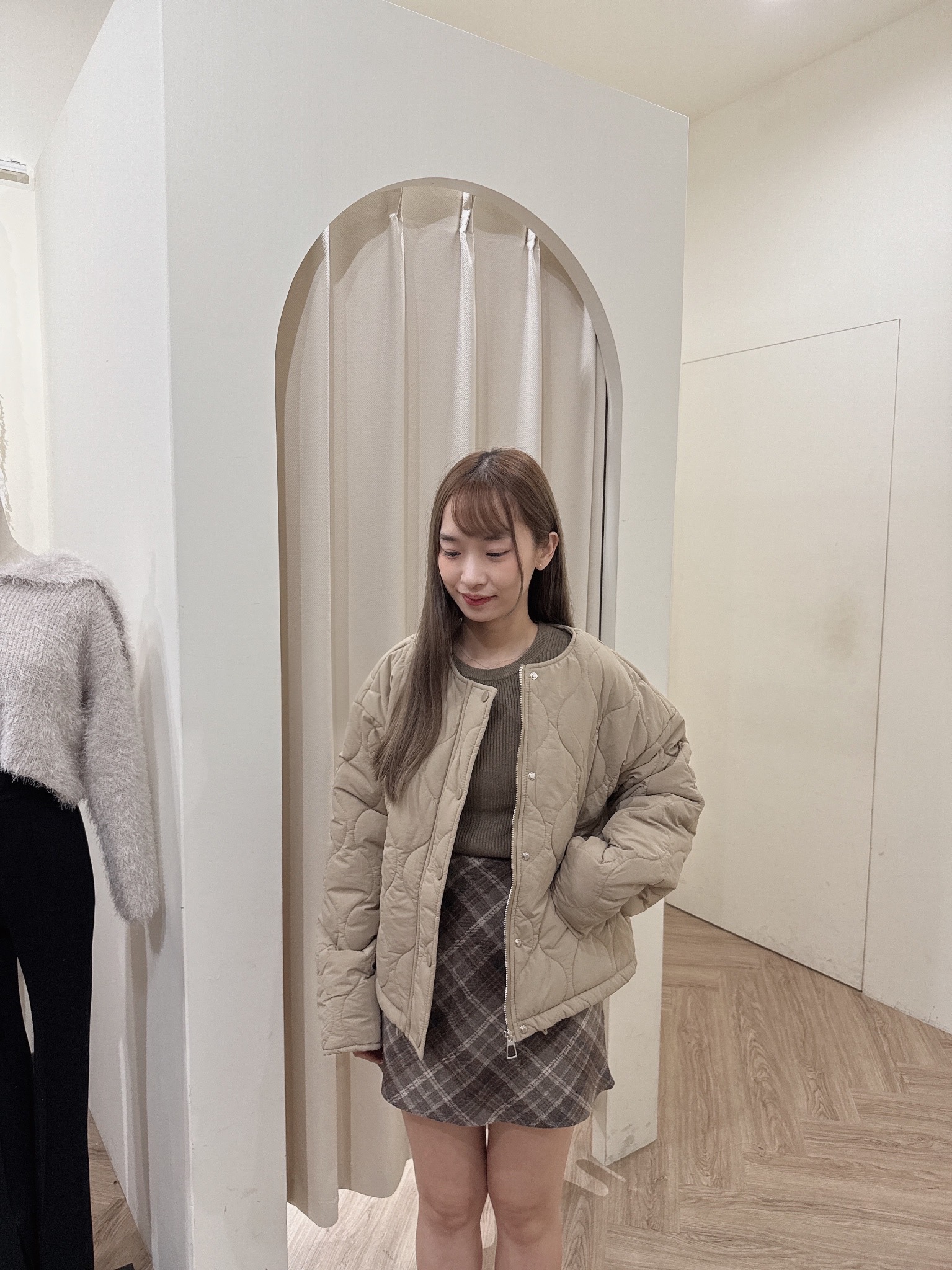 #深咖菱格紋毛呢短裙
