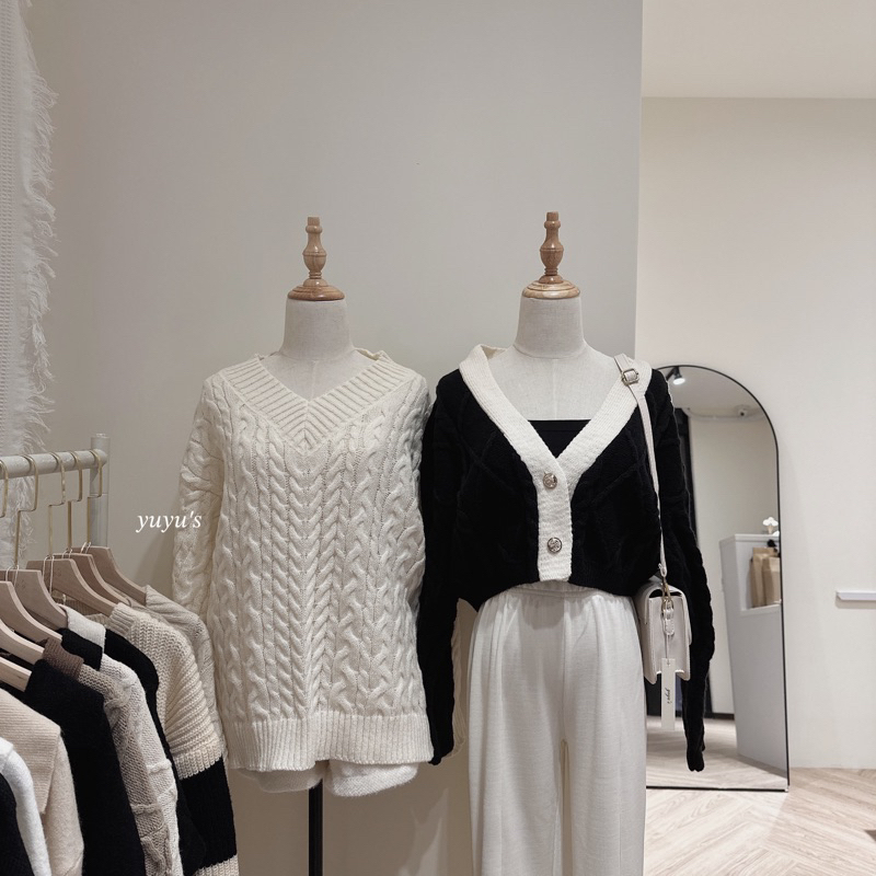 #大v領拼接短版針織毛衣