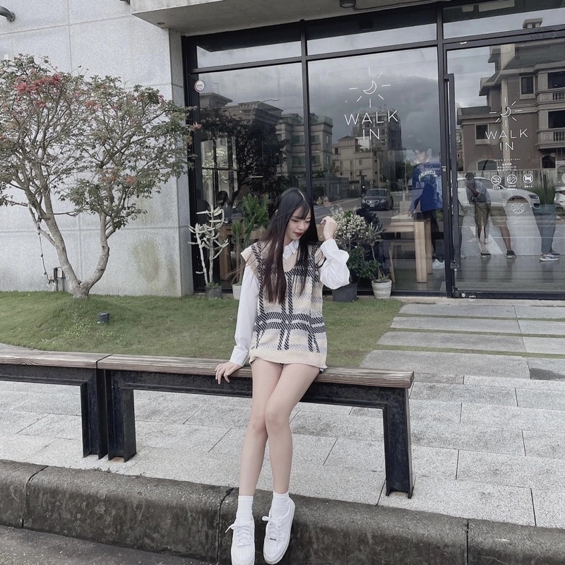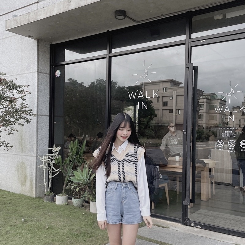 #奶藍格紋拼接針織毛衣背心