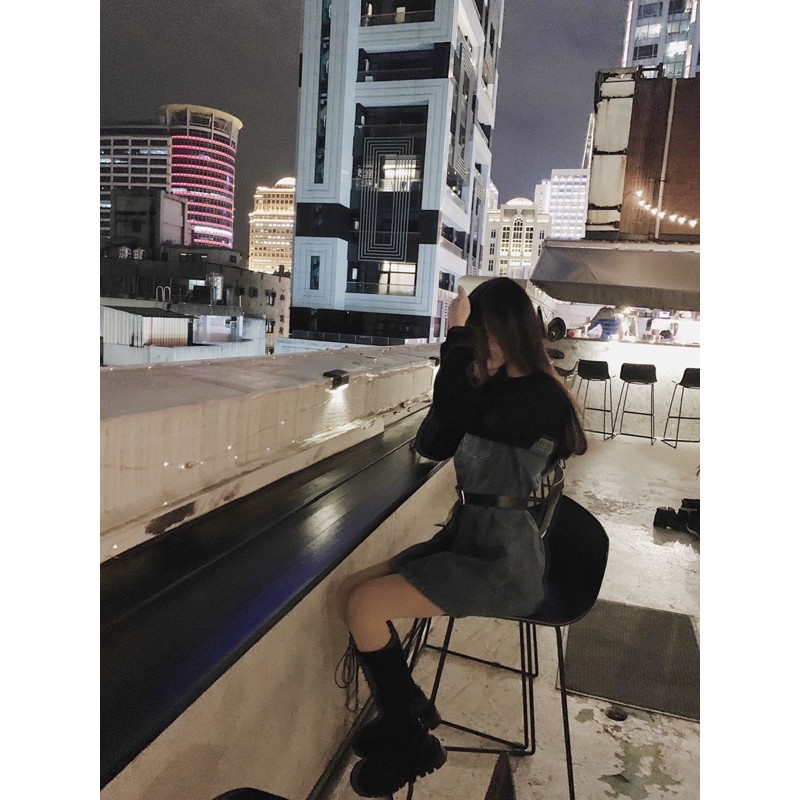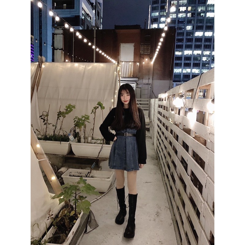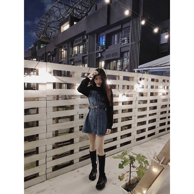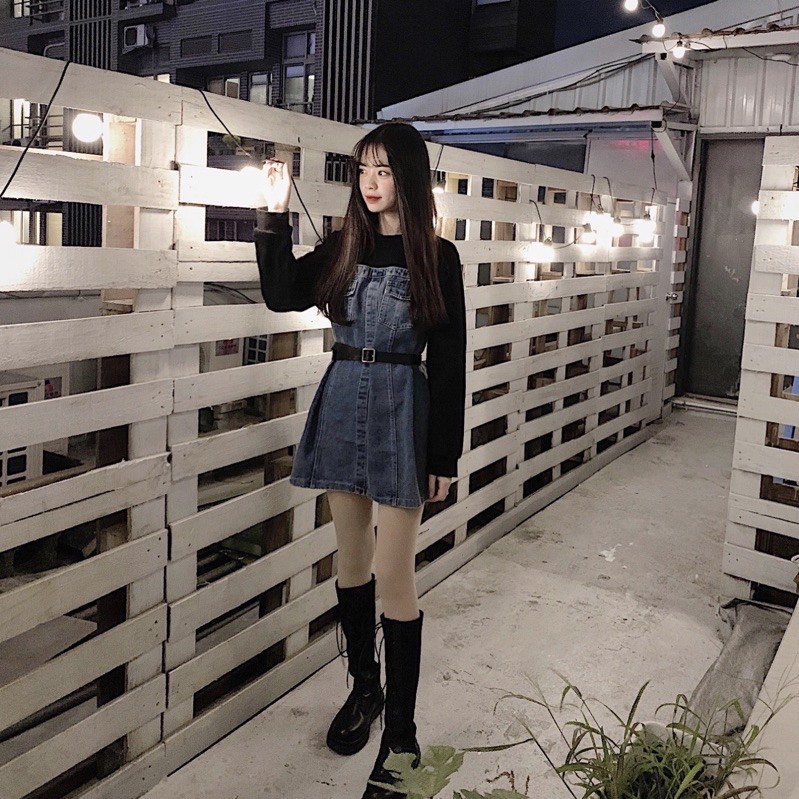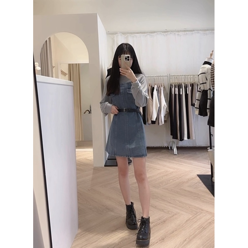 假兩件設計 袖子做是螺紋材質拼接牛仔裙