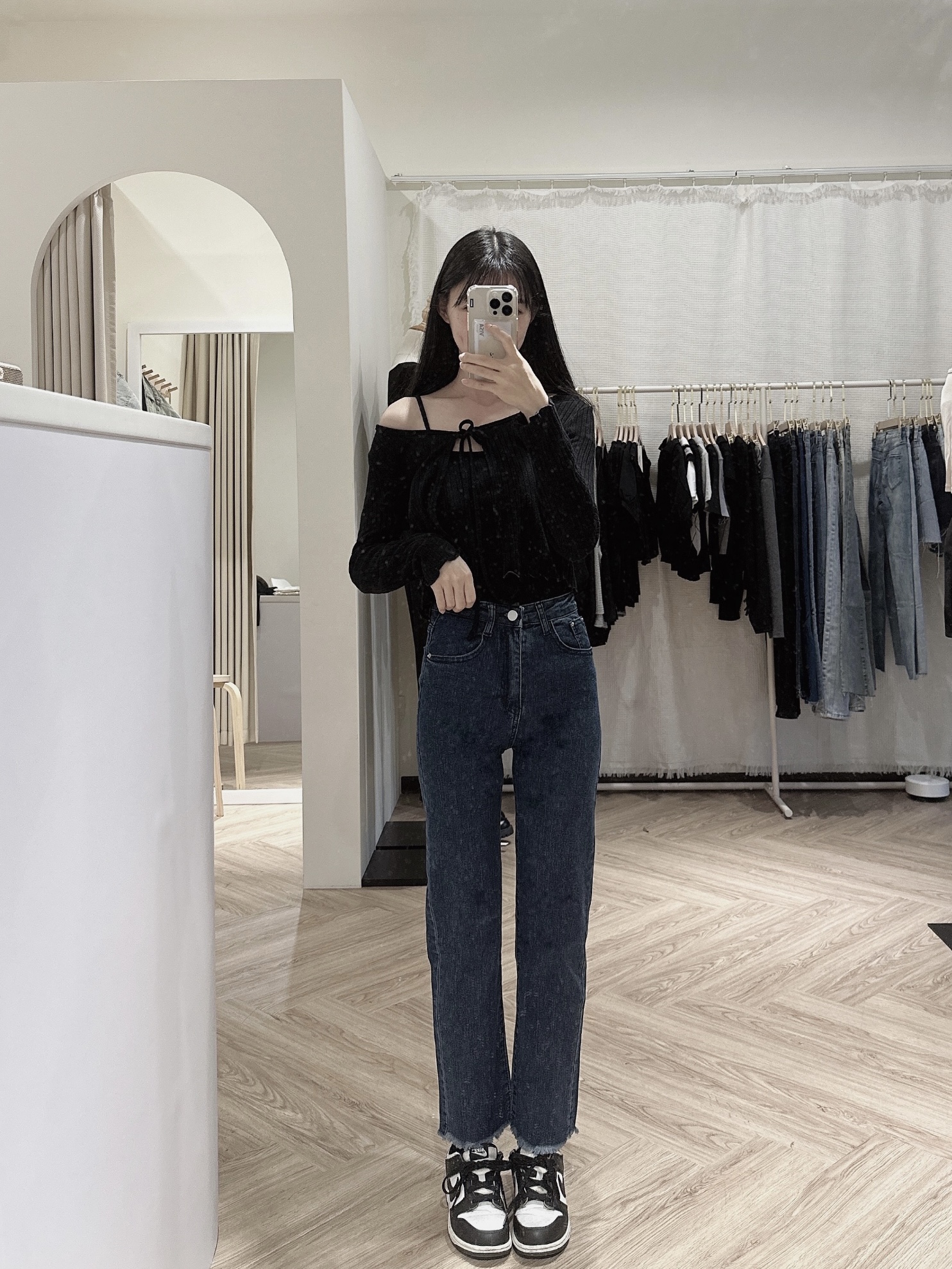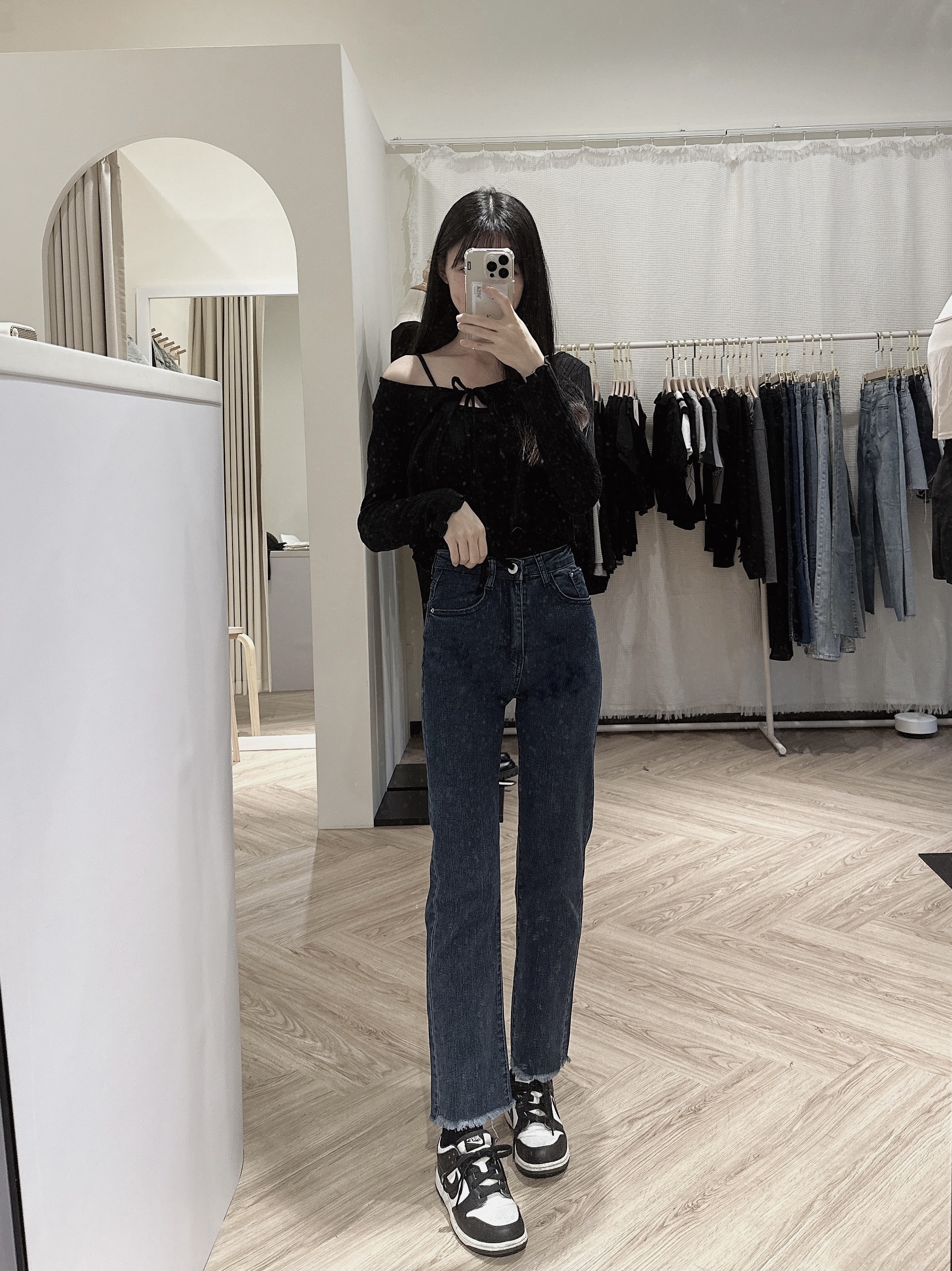 # 版型偏小高腰刷色直筒牛仔長褲