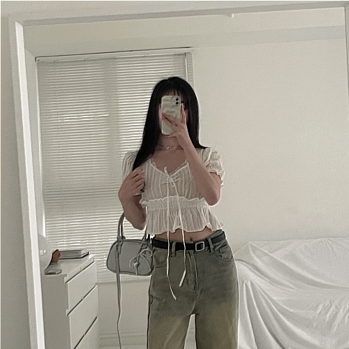 # 仙女微透蕾絲緞帶抓皺短袖