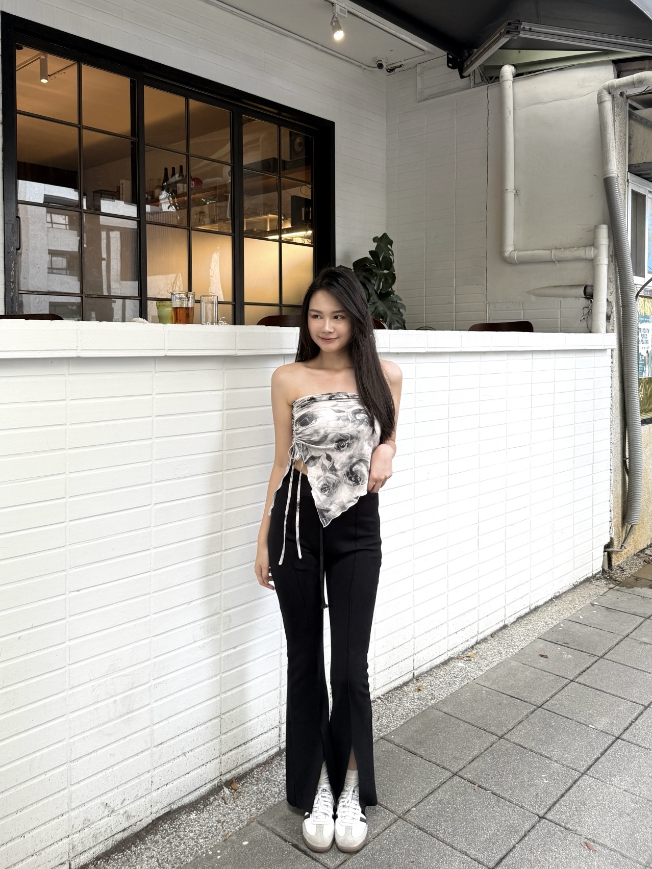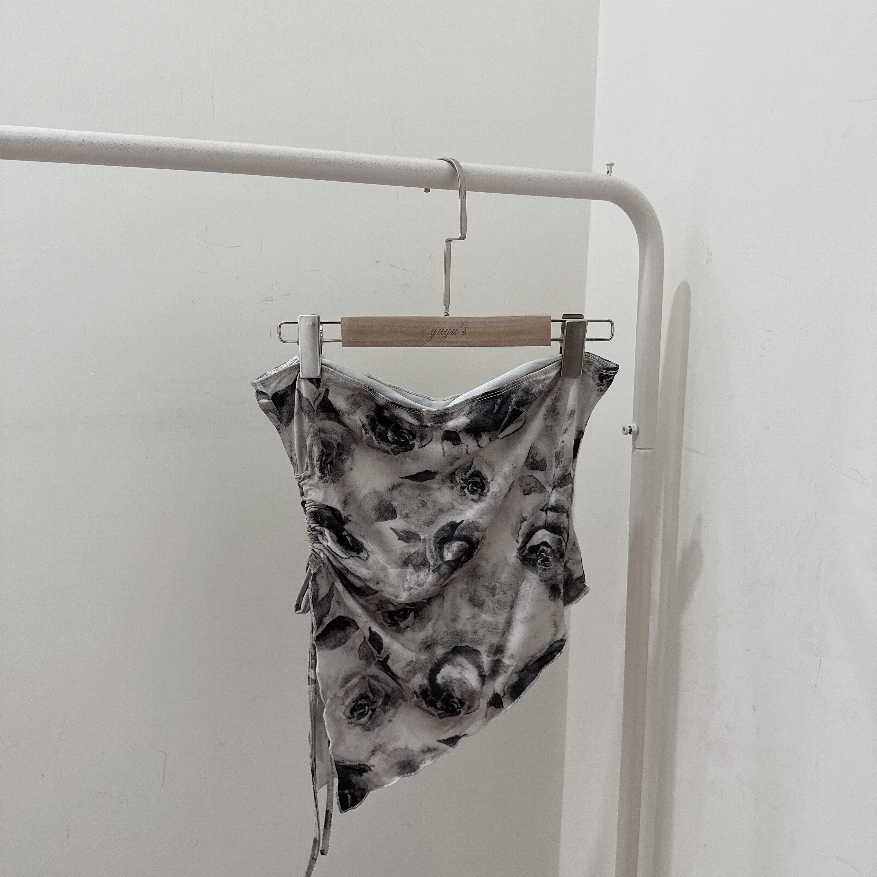 冷淡感的灰階玫瑰搭配抽皺不對稱下擺