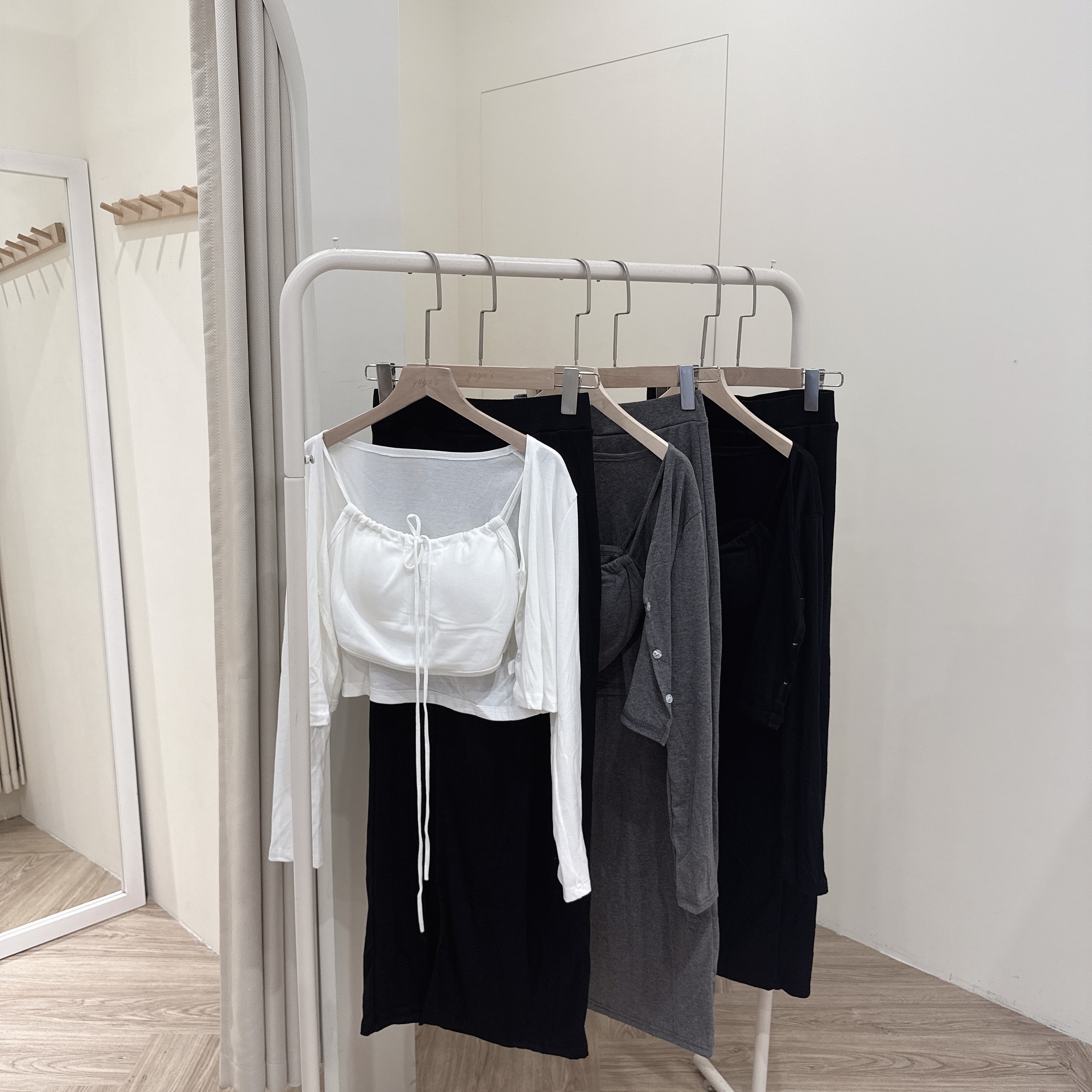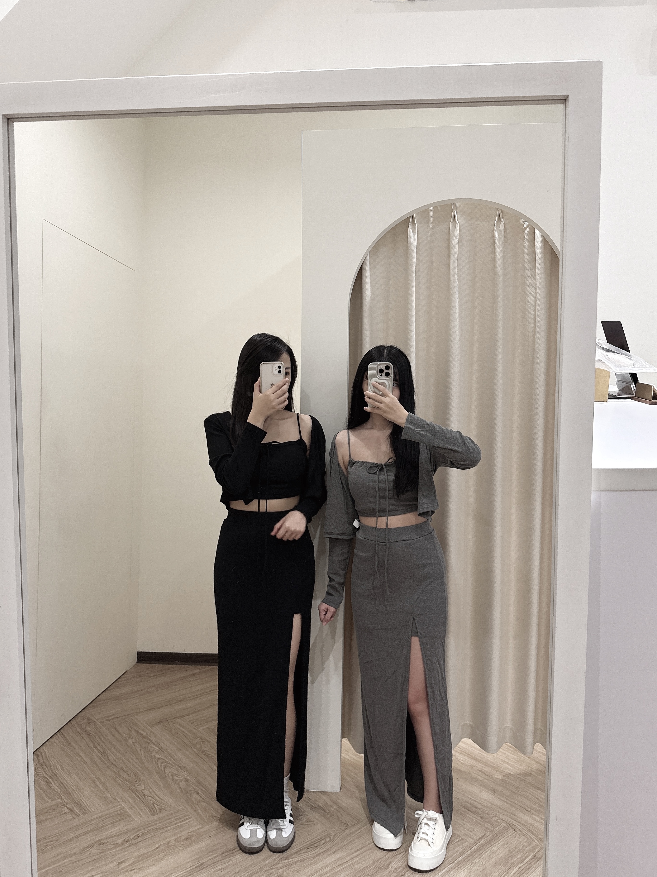 # 細肩綁帶開衩長裙三件套