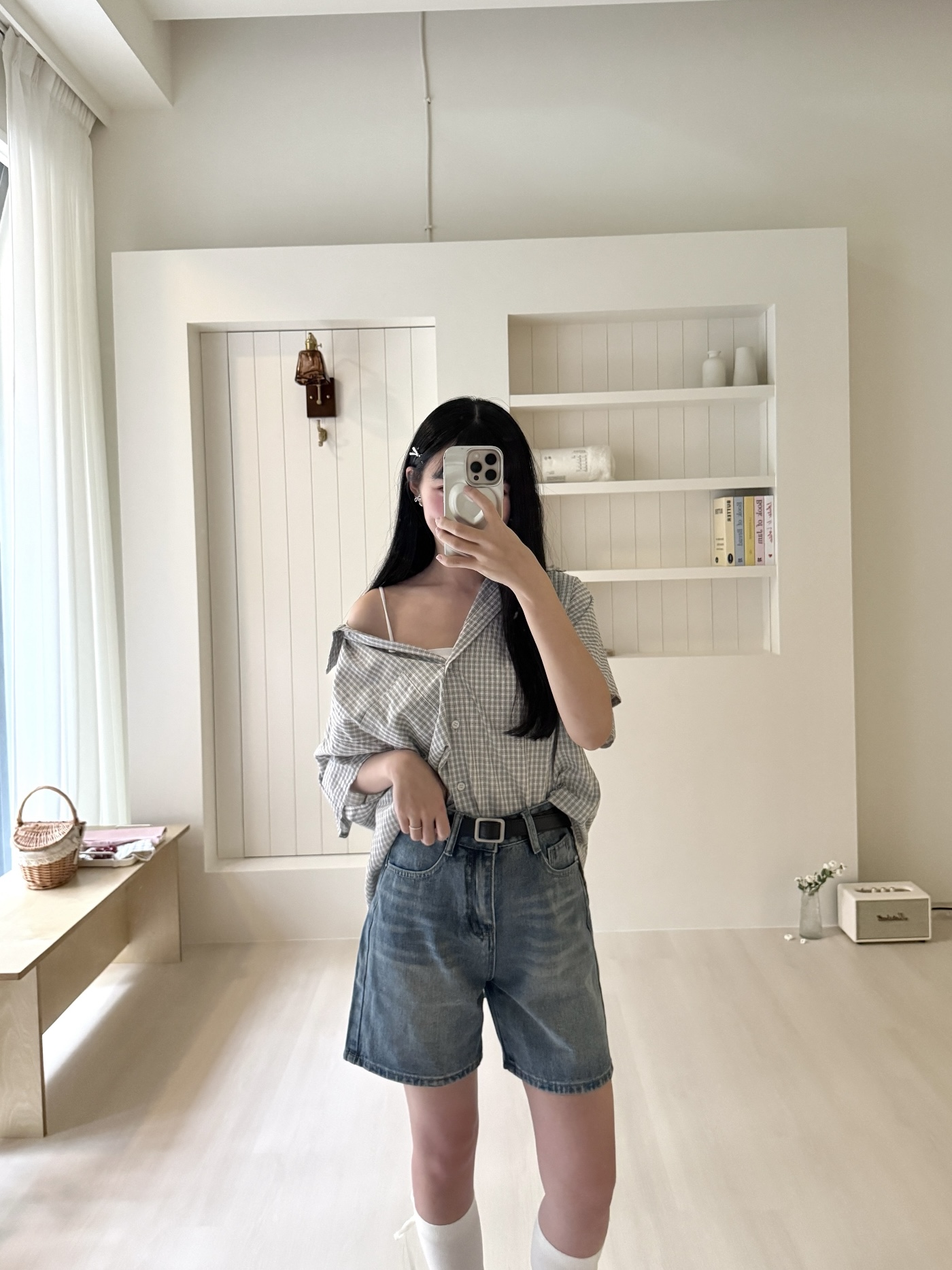 # 細格紋短袖襯衫外
