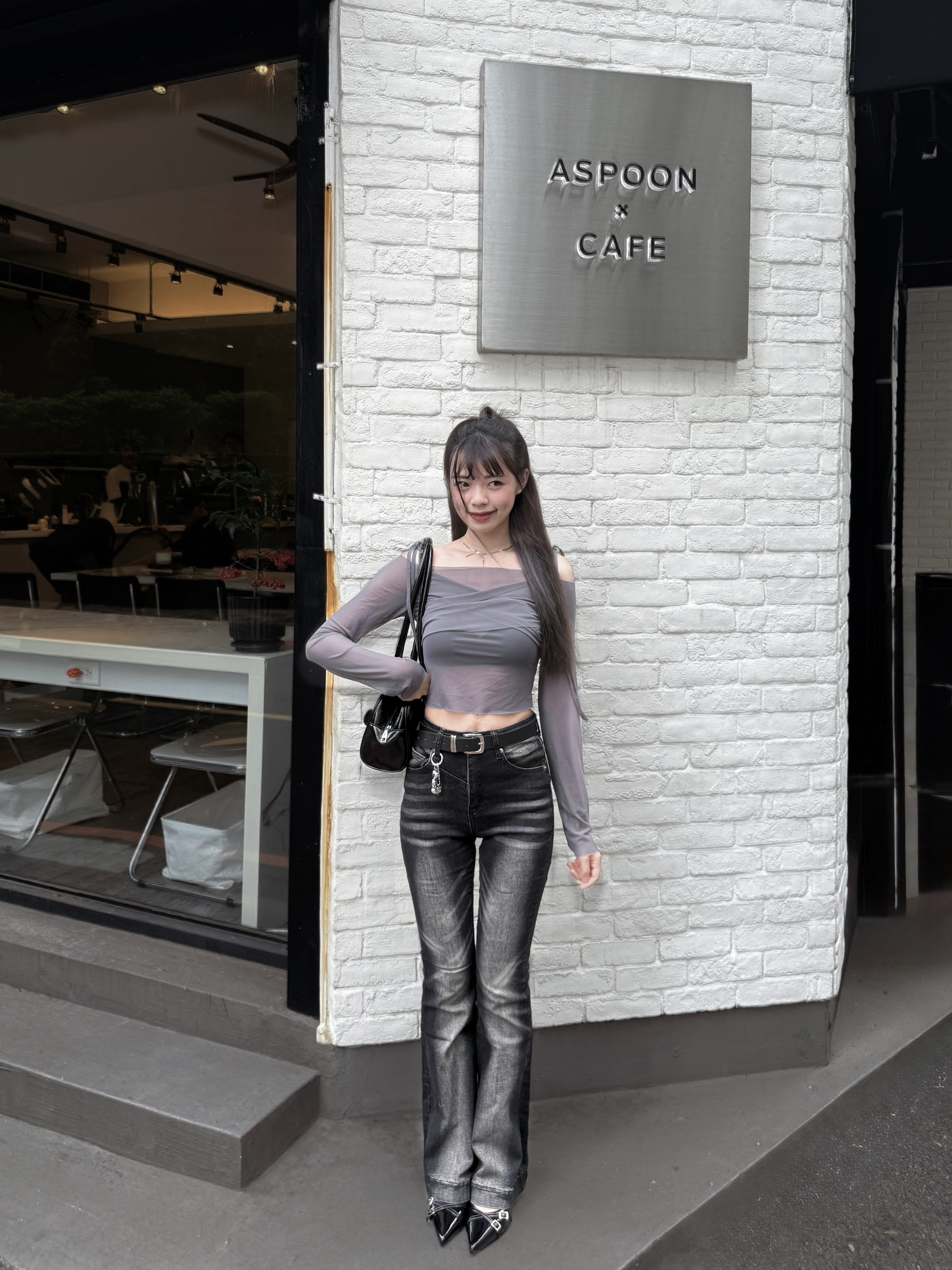 # 霧灰綁帶一字領透膚上衣