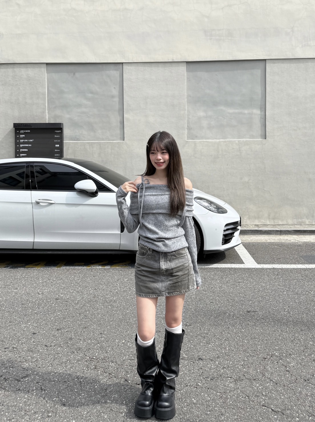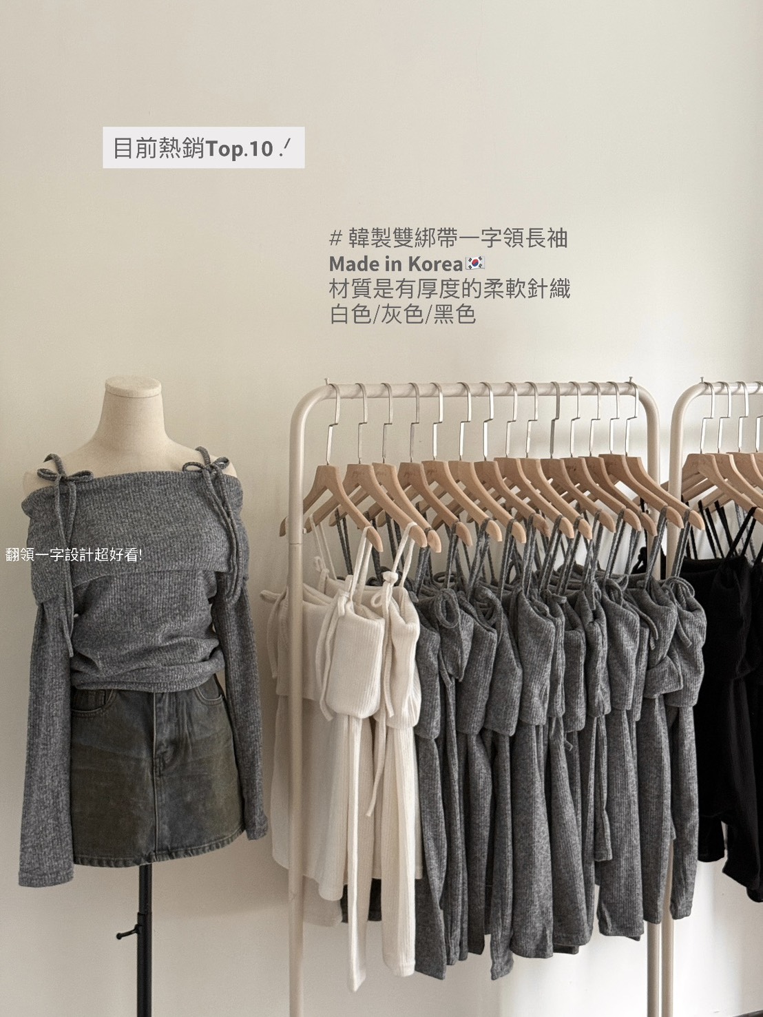 # 韓製雙綁帶一字領長袖